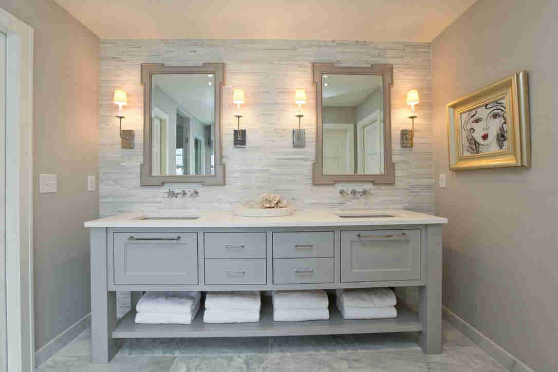 1、一個掛墻式面盆柜加鏡子旁的一個掛墻式儲物柜,足以滿足你儲藏多個衛浴用品的需要。
